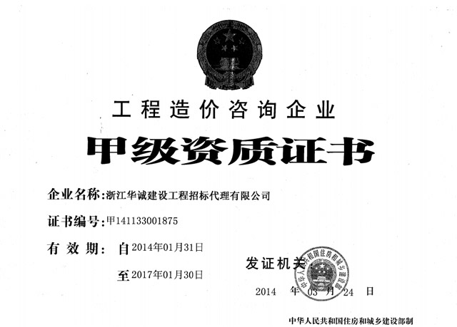 工程造價(jià)咨詢甲級(jí)資質(zhì)證書